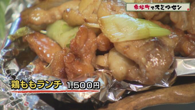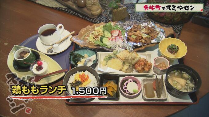 八郎さんは【鶏ももランチ】(1500円)を注文。数種もの小鉢、天ぷら、鶏モモの炒め物、味噌汁、ごはん、スイーツ、コーヒーのボリューム満点セットです。