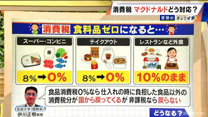 名城大学の伊川正樹教授によると「食品消費税0%なら仕入れの時に負担した食品以外の消費税分が国から戻ってくるが、非課税なら戻らない」とのことです。