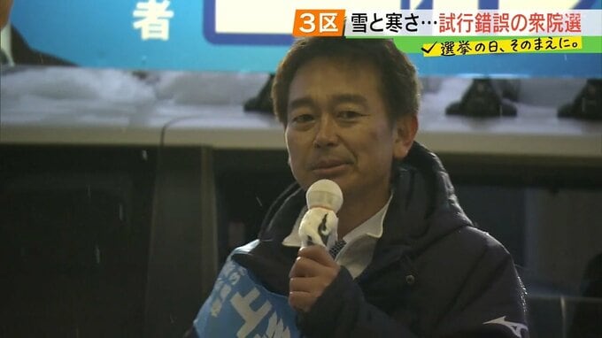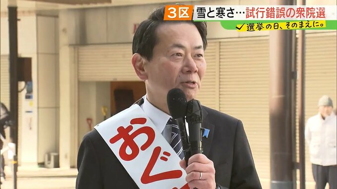 吹く風が冷たく、雪も舞った3日の会津美里町。自民党の元職・上杉謙太郎さんは街頭演説で支持を訴えました。連日、1人でも多くの有権者に会って自身の存在や政策を訴えようと雪の会津地方を回っていますが、試行錯誤が続いているといいます。