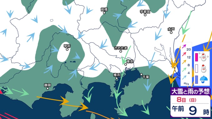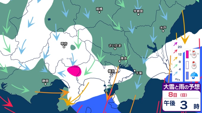 「大雪などの予想シミュレーション」をみてみると、週末7日~8日にかけては、関東や東海といった太平洋側でも雪となる可能性があります。シミュレーションでは、東京・埼玉・神奈川・千葉・山梨・群馬・栃木・茨城のほか、静岡にも雪雲のかかる時間帯があることが予想されているため、今後も最新の気象情報に留意してください。