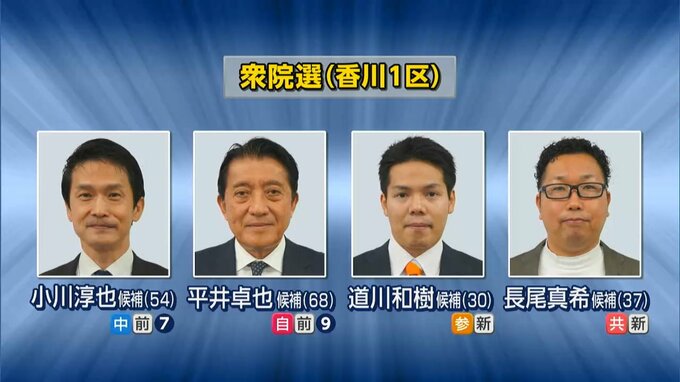 香川1区は、前職2人の9度目の対決に新人2人が絡み激戦となっています。
