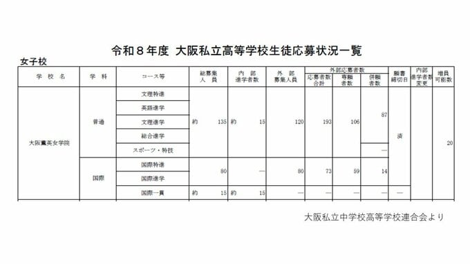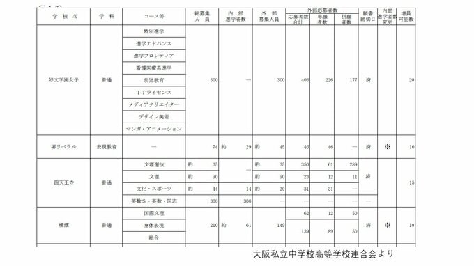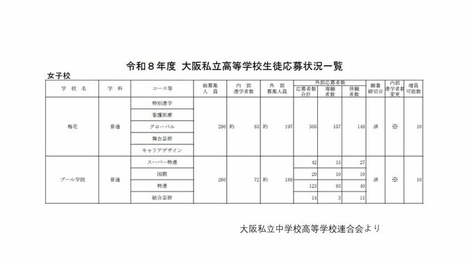 【大阪府 私立高校入試2026】近大附・上宮・桃山学院が倍率10倍超 大阪星光は3.2倍 四天王寺、清風など人気校の倍率は?私学無償化の影響で専願率は年々上昇【高校受験 私立の出願状況 全校掲載】 毎日放送 2026年2月5日(木) 18:20 国内 【画像一覧】四天王寺・大阪女学院・大阪成蹊女子など女子高の倍率状況を確認する