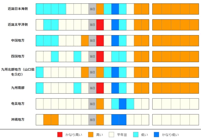 ・2週目の予報は中心の日に前後2日間を加えた5日間の平均(平均気温の5日間平均)です。平均期間は中心の日の下に表示しています。2週目のかなり高い(かなり低い)は、かなり高い(かなり低い)気温となる確率が30%以上のときに表示します。