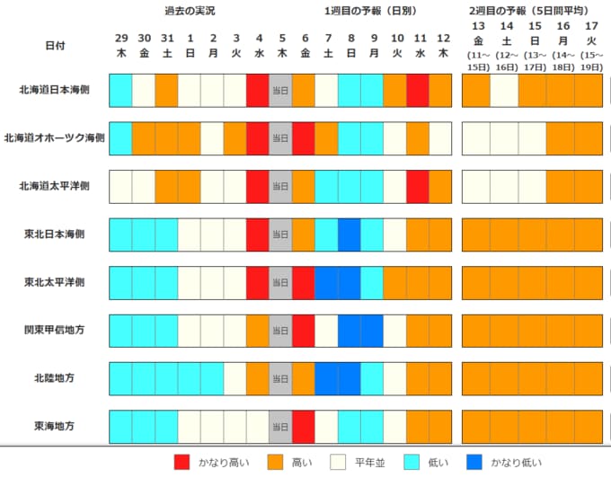 北・東・西日本の気温は、6日は高いですが、7日頃からの3日間程度は低い日が多く、冬型の気圧配置が強まるため、8日頃には北・東・西日本日本海側を中心に大雪となる可能性があります。交通障害などに注意するとともに、除雪などの対応に留意してください。その後は寒気の影響が弱まるため高い日が多いでしょう。