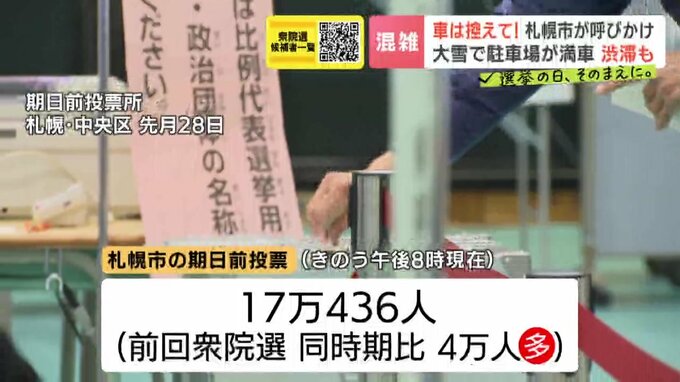 札幌市選挙管理委員会によりますと、4日午後8時現在で、市内では17万436人が期日前投票を行っていて、前回の衆院選の同じ時期より4万人あまり多いということです。