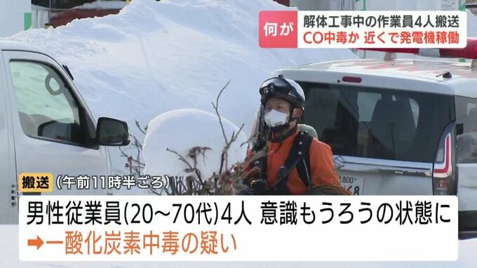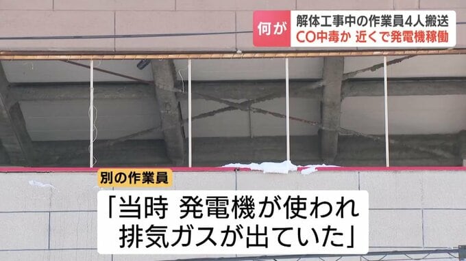 5日午前、札幌市厚別区でホテルの解体工事をしていた作業員4人が一酸化炭素中毒の疑いで病院に運ばれました。