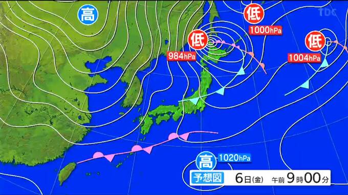 6日午前9時の予想天気図です。朝は東北地方を寒冷前線が通過するでしょう。その後は冬型の気圧配置に変わり、等圧線の間隔が狭くなる見込みです。