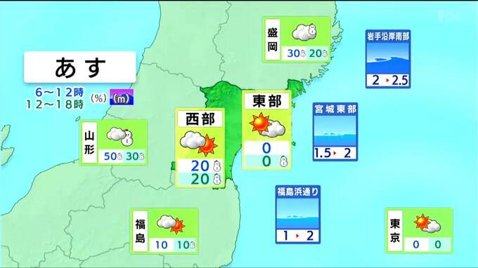東部を中心に晴れますが、西部は雪や雨の降る所もあるでしょう。西寄りの風が強まるため、海上では一日を通して、東部の陸上でも明け方から午後9時頃まで強風に注意してください。