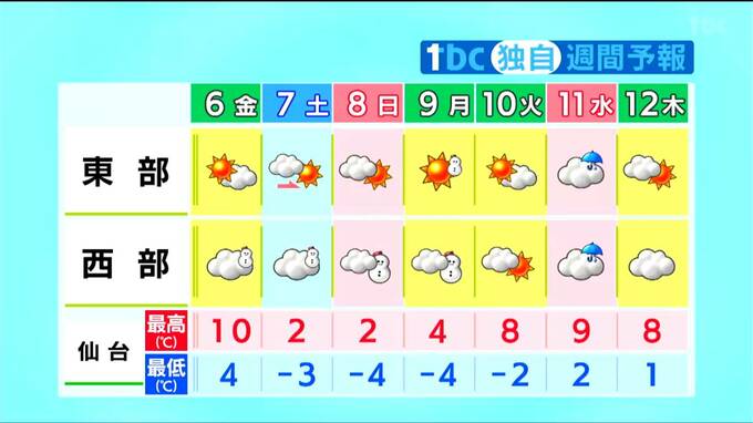 東部は晴れ間の出る日が多いですが、月曜は雪が、建国記念の日の来週水曜は雨が降りそうです。西部は雪や雨の降る日が多いでしょう。気温の変化は大きく、土曜から月曜は厳しい寒さとなり、朝は冷え込みも強まる見込みです。