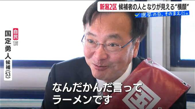 新潟2区『選挙の日、そのまえに。』候補者の“人となり”が見える横顔紹介【衆議院選挙 2026】 新潟放送 2026年2月6日(金) 18:46 国内 暮らし・マネー ラーメンをよく食べる 自民党の国定勇人さんが選挙期間中によく食べるものは? 「なんだかんだ言って、ラーメンです。あんまり言うと農家の皆さんに怒られるかな(笑)」 「その土地、その土地の地理感覚を、ラーメン屋さんをベースに作り上げていく…」