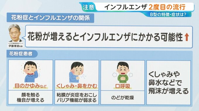 今流行しているインフルエンザに、花粉がさらに拍車をかける可能性があると言います。