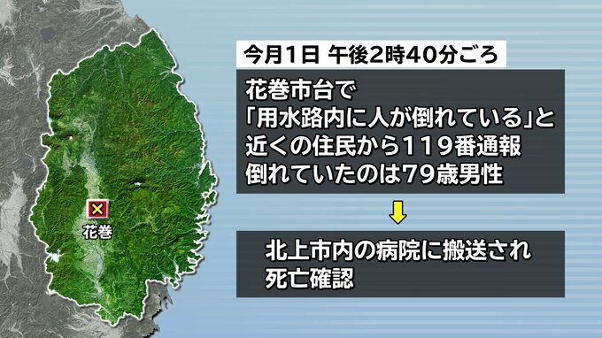消防によりますと、1日午後2時40分ごろ、花巻市台で「用水路内に人が倒れている」と近くの住民から119番通報がありました。