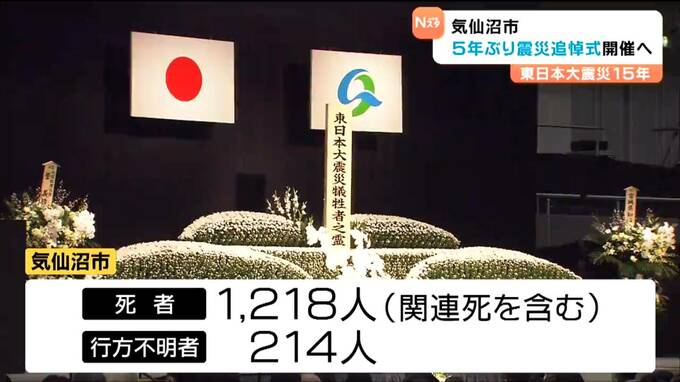 気仙沼市によりますと、3月11日に開く東日本大震災の追悼式は気仙沼市民会館が会場で、開催は5年ぶりです。気仙沼市では、震災で関連死を含め1218人が死亡し214人が行方不明のままとなっています。市は2012年から毎年、追悼式を開いてきましたが、震災発生から10年を区切りに、翌年から式の開催をやめ自由献花としてきました。2026年は、震災発生から15年の節目となることから開催を決めたということです。県内では南三陸町と山元町でも5年ぶりに、また、七ヶ浜町でも3年ぶりに追悼式が開かれるほか仙台市、石巻市、東松島市でも開催される予定です。