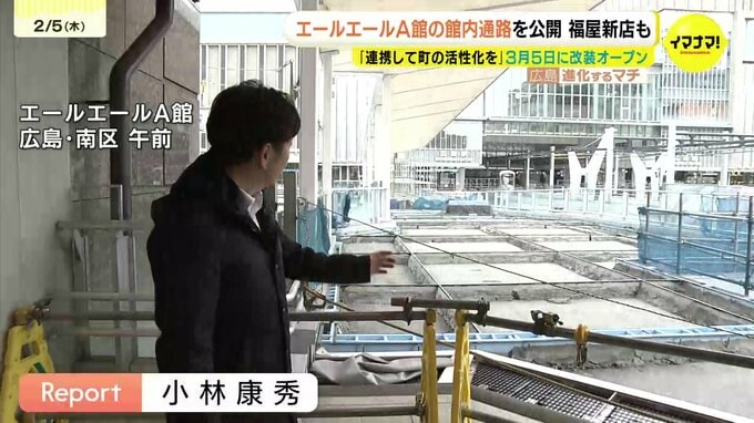 エールエールA館は3月5日に「エールエールHIROSHIMA」に名を改めて、広島駅側のペデストリアンデッキとともに、連絡通路の供用を始めます。