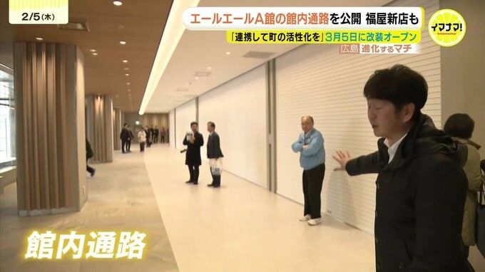 広島駅とのペデストリアンデッキにつながり、エールエールA館の建物を貫く館内通路が報道陣に公開されました。地元の人たちも見学しました。