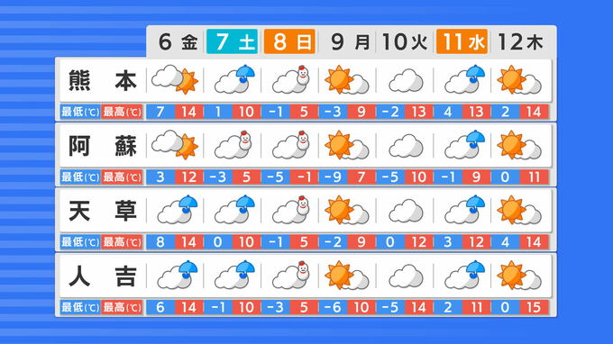 【熊本の降雪予想】2月8日(日) “平地でも積雪の恐れ” 衆議院選挙の投票日に『今季最強クラス』の寒波 熊本放送 2026年2月5日(木) 19:12 国内 天気 阿蘇市は「真冬日」か 8日の最高気温は、熊本県内各地で5℃に届かない予想です。阿蘇市は1日中氷点下の「真冬日」となる可能性がありそうです。 この週末は、気象情報をこまめに確認してください。