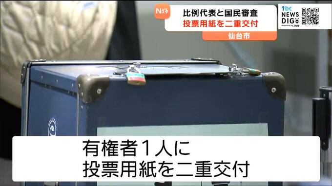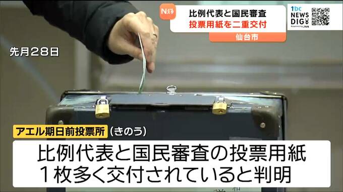 仙台市選挙管理委員会によりますと、2月4日、アエルの期日前投票所で、定期的に実施している確認作業をしたところ、比例代表と国民審査の投票用紙が1枚多く交付されていることがわかりました。