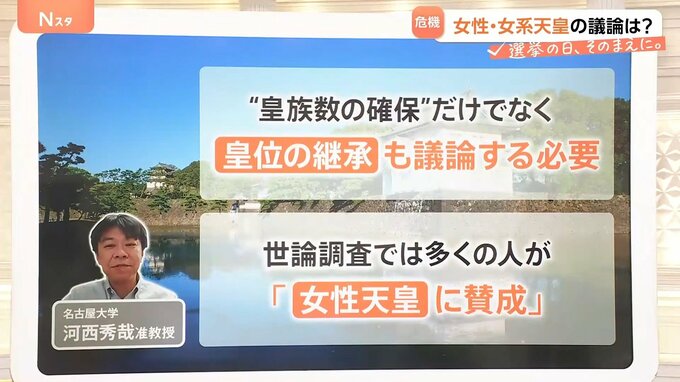 名古屋大学の河西秀哉准教授によると「“皇族数の確保”だけでなく、皇位の継承も議論する必要がある」ということです。さらに世論調査では、多くの人が「女性天皇に賛成」をしているという事実もあります。