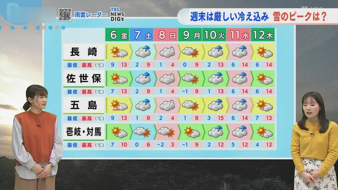 7日(土)は長崎や佐世保、五島では朝早い時間に雨やみぞれ、高台では雪が降る可能性がありますが、降る時間は短く、日中は晴れ間も出るかもしれません。特に注意が必要なのは8日(日)で、しっかりとした雪の可能性が出てきました。壱岐・対馬ではマイナス2度まで冷え込む予想です。