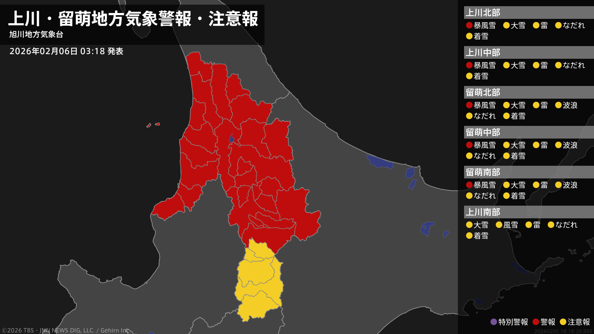 気象台は、午前3時18分に、暴風雪警報を旭川市、士別市、名寄市、鷹栖町、東神楽町、当麻町、比布町、愛別町、上川町、東川町、美瑛町、和寒町、剣淵町、下川町、美深町、音威子府村、中川町、幌加内町に発表しました。