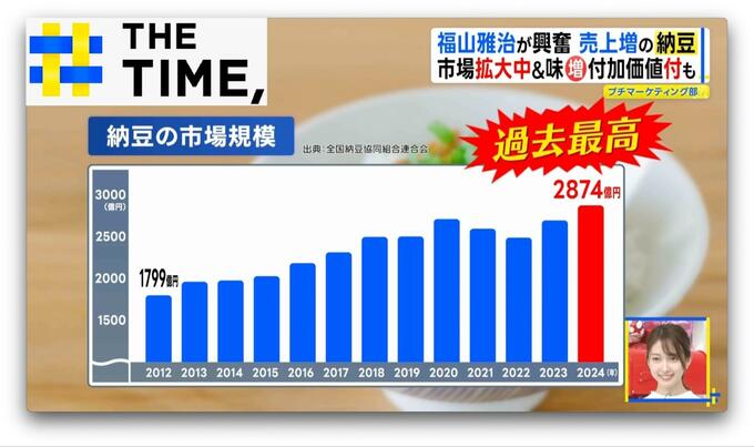 なかでも「納豆」の市場規模は右肩上がりで、2024年には2874億円と過去最高を記録しています。(※全国納豆協同組合連合会)