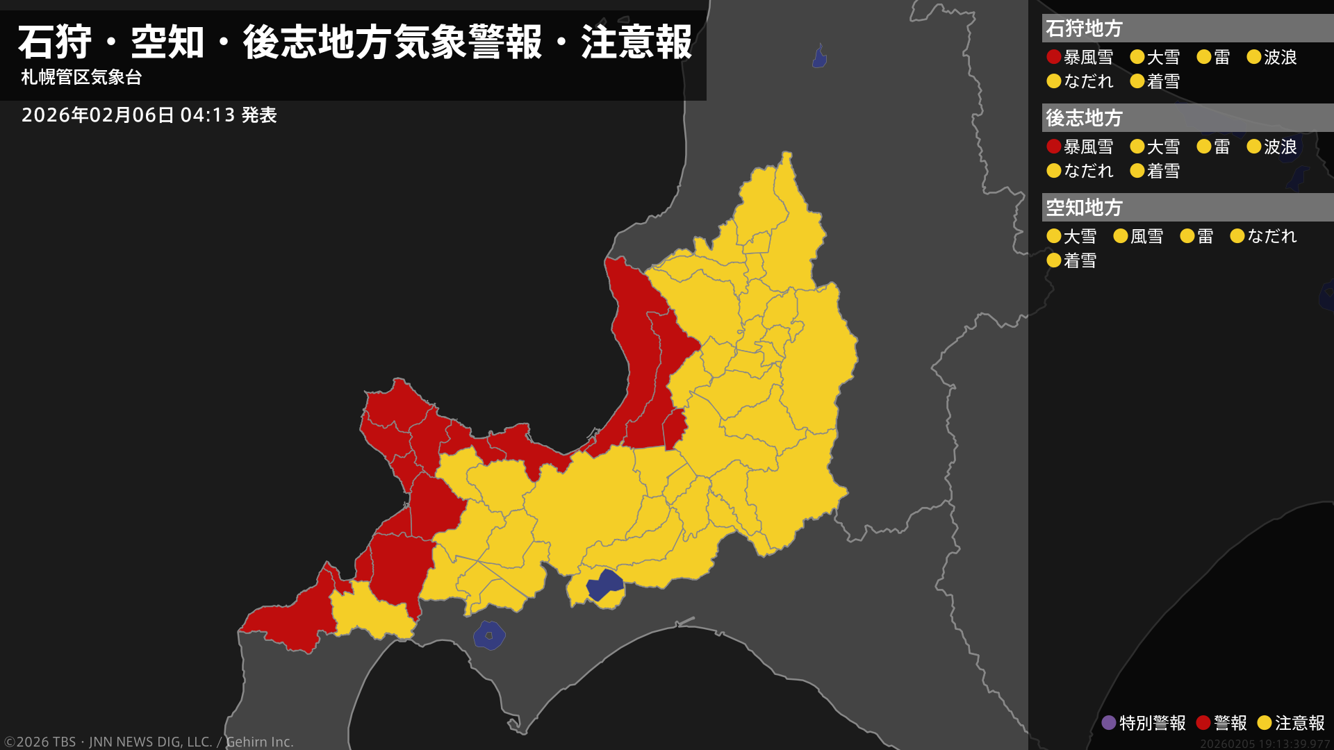 気象台は、午前4時13分に、暴風雪警報を小樽市、石狩市、当別町、新篠津村、島牧村、寿都町、蘭越町、共和町、岩内町、泊村、神恵内村、積丹町、古平町、余市町に発表しました。