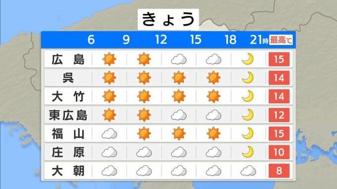 この後も雲が優勢ですが、南部を中心に日差しが届くでしょう。予想最高気温は、広島や福山で15℃ 呉14℃となっています。きょうの日中まで春の陽気が続き、お出かけ日和になるでしょう。