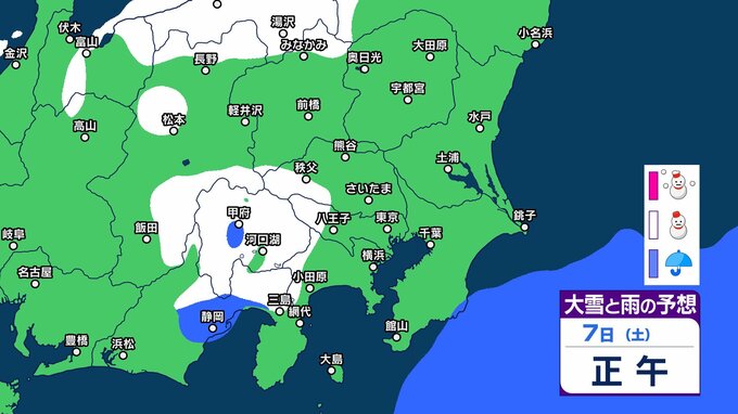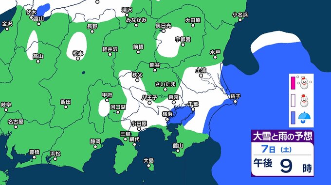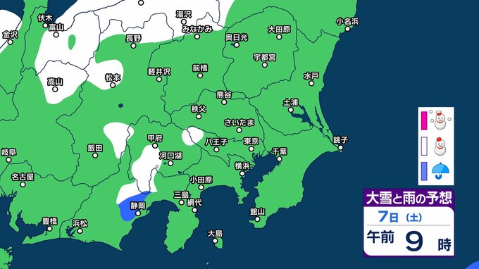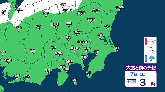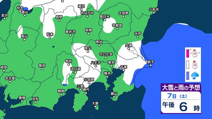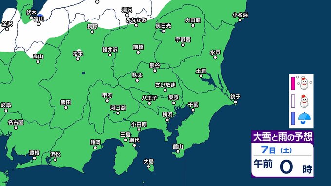気象庁によりますと、関東甲信地方では、7日から8日にかけて、山沿いや山地を中心に、平地でも大雪となる所があるでしょう。