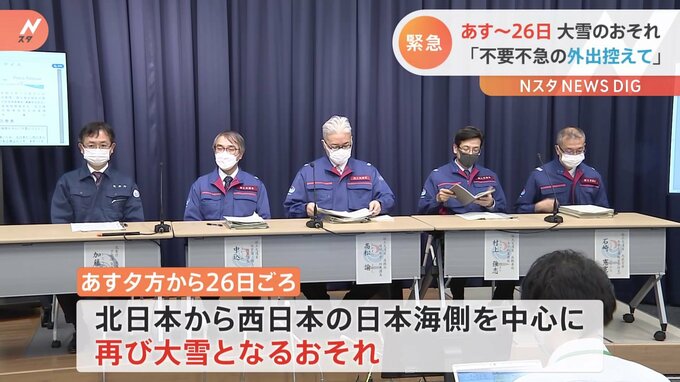 気象庁と国土交通省はさきほど、あす夕方から26日ごろにかけて北日本から西日本の日本海側を中心に再び大雪のおそれがあるとして、不要不急の外出をしないよう求める緊急の呼びかけを行いました。気象庁によります…