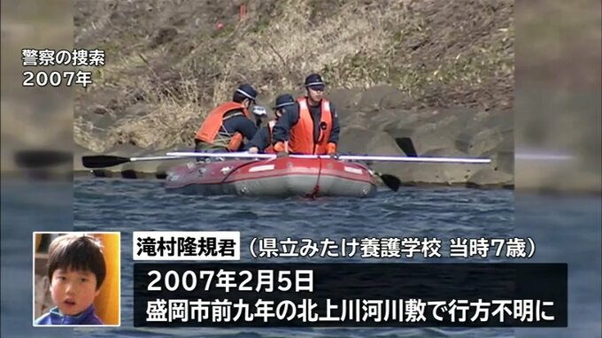 県立みたけ養護学校に通っていた滝村隆規君、当時7歳は19年前の2007年2月5日、盛岡市前九年の北上川近くの路上で遊んでいたところ、行方が分からなくなりました。