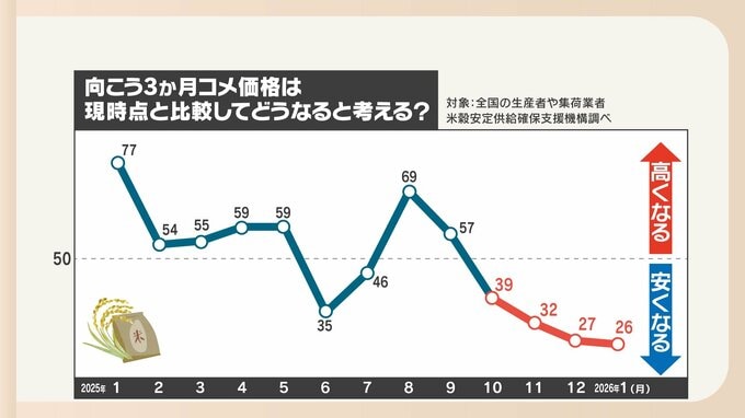 高止まりが続くコメの価格について、向こう3か月は安くなる見通しが強まっていることが分かりました。