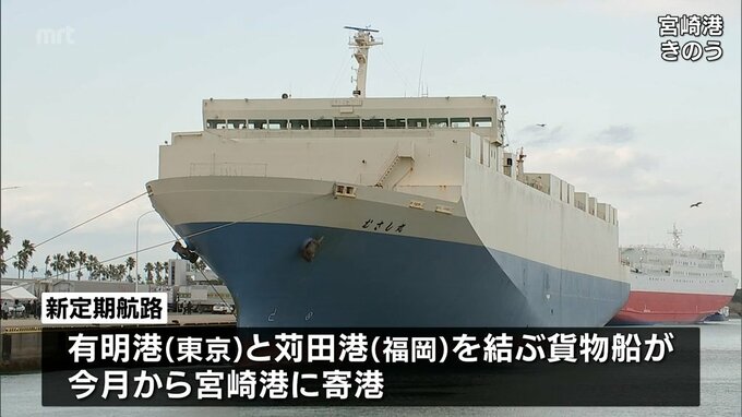 東京と宮崎港を結ぶ貨物を輸送する定期航路が新たに開設され、初の入港にあわせて宮崎港で歓迎式典が行われました。新たな定期航路は、東京の有明港と福岡県の苅田港を結ぶ貨物船が新たに宮崎港に寄港する形で今月…