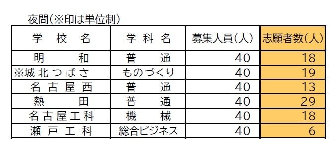 半田商業、大府、豊田工科、岡崎、安城、蒲郡など(夜間)の志願状況は?