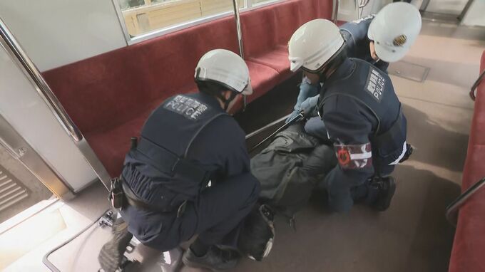 ことし9月と10月に開かれるアジア・アジアパラ競技大会への防犯対策の一環で、2025年度から東山線の一部の車両に導入した「防刃傘」を活用しながら、不審者を取り押さえるまでの一連の流れを確認しました。