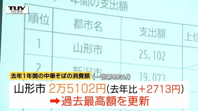 山形市の去年1年間の一世帯当たりの中華そばの消費額は2万5102円で、過去最高となった去年の消費額をさらに更新する(2713円上回る)快挙となりました。
