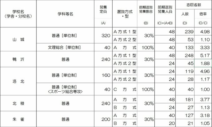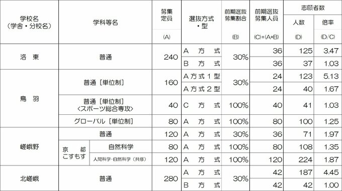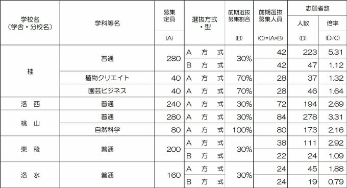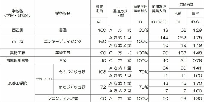 【京都府公立高校入試2026】田辺5.61倍など『倍率5倍超』が4校 堀川(探究)1.55倍 西京、嵯峨野は?あの学校の倍率は昨年度から上がった?【令和8年度 高校受験倍率 前期入試全校掲載】 毎日放送 2026年2月6日(金) 15:00 国内 【京都の公立 志願状況】山城高校・鴨沂高校・洛北高校・北稜高校・朱雀高校の倍率一覧 【京都の公立 志願状況】洛東高校・鳥羽高校・嵯峨野高校・北嵯峨高校の倍率一覧 【京都の公立 志願状況】桂高校・洛西高校・桃山高校・東稜高校・洛水高校の倍率一覧 【京都の公立 志願状況】京都すばる高校・向陽高校・乙訓高校の倍率一覧 【京都の公立 志願状況】西乙訓高校・西京高校・美術工芸高校・京都堀川音楽高校・京都工学院高校の倍率一覧