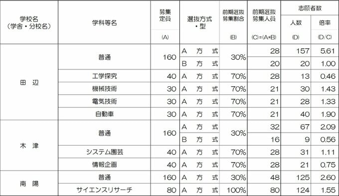 【京都府公立高校入試2026】田辺5.61倍など『倍率5倍超』が4校 堀川(探究)1.55倍 西京、嵯峨野は?あの学校の倍率は昨年度から上がった?【令和8年度 高校受験倍率 前期入試全校掲載】 毎日放送 2026年2月6日(金) 15:00 国内 【京都の公立 志願状況】堀川高校・日吉ヶ丘高校・紫野高校・開建高校の倍率一覧 【京都の公立 志願状況】東宇治高校・莵道高校・城南菱創高校の倍率一覧 【京都の公立 志願状況】城陽高校・西城陽高校の倍率一覧 【京都の公立 志願状況】京都八幡高校・久御山高校高校の倍率一覧 【京都の公立 志願状況】田辺高校・木津高校・南陽高校の倍率一覧