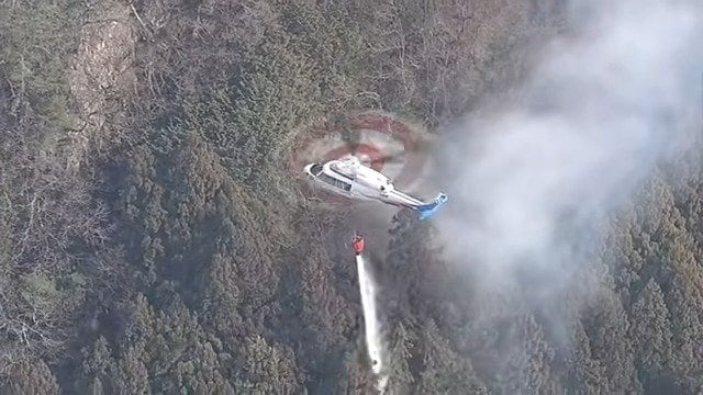 消防によりますと、山のふもとには住宅がおよそ10軒ありますが、火はふもとの辺りから出たあと、山頂に向かって燃え広がっているため、現時点で住民への避難は呼びかけていないということです。