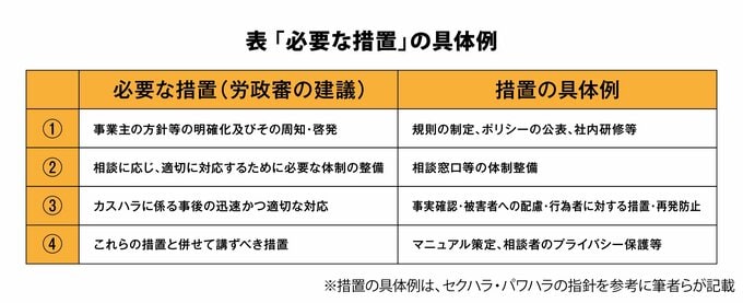 改正労推法第33条第1項は、先に見たとおり、事業者(会社)が雇用管理上「必要な措置」を講ずべき旨を定めているが、同条第2項は「労働者がカスハラの相談を行ったこと等を理由とする不利益取扱いの禁止」、同条第3項は「他の事業主から措置義務実施に関し協力を求められた場合に応ずる努力義務」も定めている(注9)。