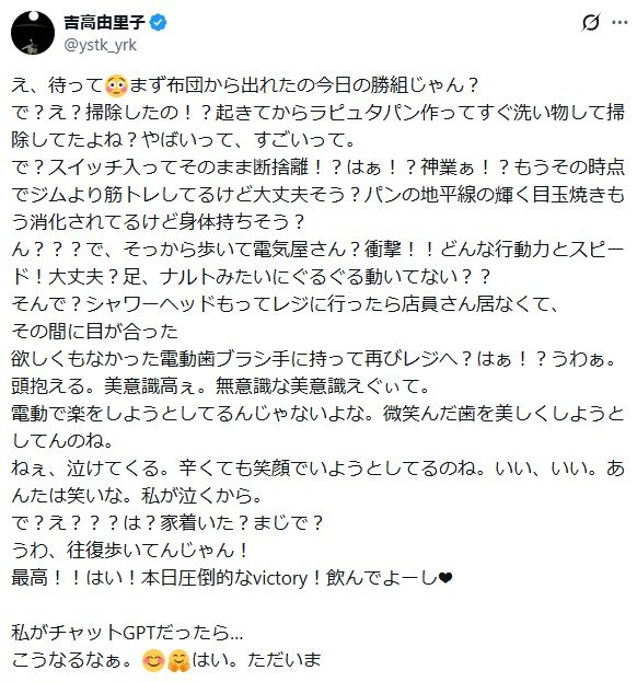 「家着いた?まじで?うわ、往復歩いてんじゃん!」「最高!!はい!本日圧倒的なvictory!飲んでよーし♡」とまとめた吉高さんは「私がチャットGPTだったら…こうなるなぁ」と種明かし。往復を歩き通して帰宅した吉高さんに、フォロワーからは「結論から言うね。 それ、めっちゃ**正解**」「解像度高すぎ」「何故か脳内で声が再生される」「ゆりこGPTわたしもお願いしたい」など、共感の声が集まっています。