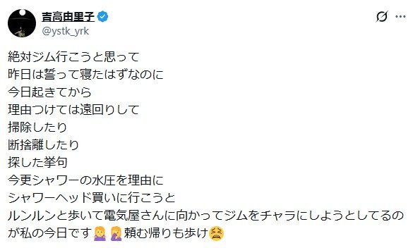 吉高さんは「絶対ジム行こうと思って 昨日は誓って寝たはずなのに」「今日起きてから 理由つけては遠回りして 掃除したり 断捨離したり」と、他に気をそらせてしまっていることを振り返りました。