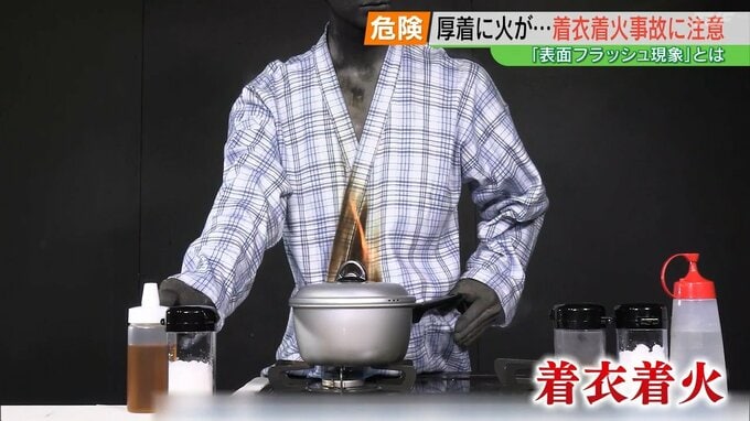 NITE・製品評価技術基盤機構が行った実験の映像です。味噌汁を温めなおそうと、ガスコンロを点火。その時うっかり近づきすぎると、あっという間に衣服に火が移り「着衣着火」の事故に繋がります。