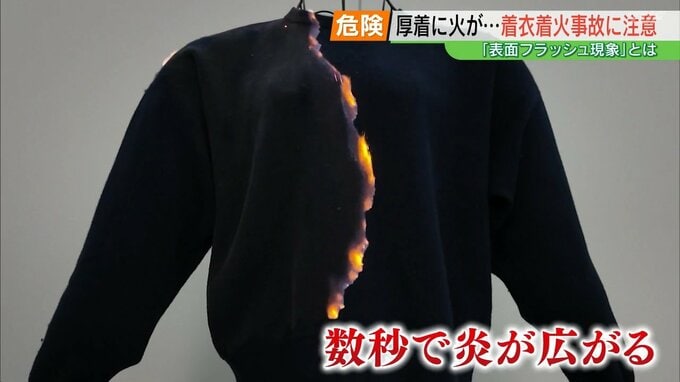 そして、特にこの時期、着衣着火が起こりやすい1つの要因として、NITEが指摘するのが「厚着」です。セーターに近づけた炎は、わずか数秒で全体に広がります。