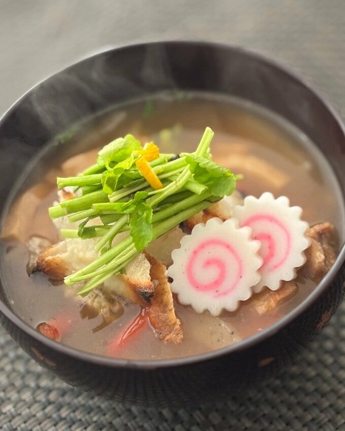 木村さんは、濃い目のお汁にこんにゃくやにんじんなどが垣間見え、なると巻きと焼き餅の上に三つ葉と柚子の皮が載せてある、具だくさんのお雑煮の写真を投稿。「何度でもお雑煮を 食べたくなるんだなぁ」と、しみじみとした思いを伝えています。