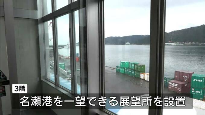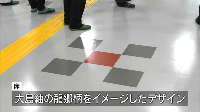 おととし1月に着工し今月、完成しました。床には、大島紬の龍郷柄をイメージしたデザインがあしらわれ、3階には名瀬港を一望できる展望所を設置するなど、くつろげる場所としての工夫も施されています。