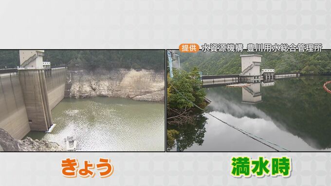 宇連ダムは、豊橋市など東三河の5つの市に水を供給する豊川用水の水源ですが、平年は50%を超える貯水率は、きょう午前0時時点で5.3%。豊川用水全体の貯水率も16.5%まで落ち込み、1月28日から節水対策を水道用水で17%・農業用水と工業用水で30%に引き上げました。
