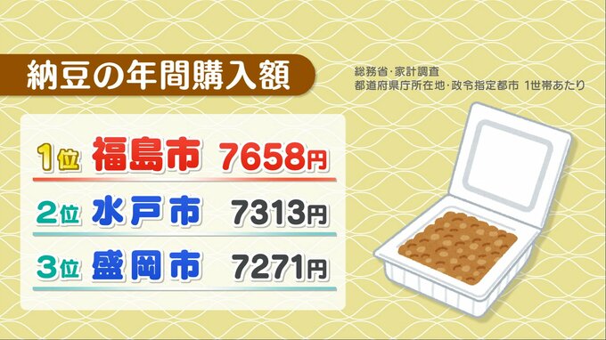 ご飯のお供に欠かせない納豆。全国の都道府県庁所在地と政令指定都市を対象に、去年行われた総務省の家計調査で、福島市は、納豆の購入額が1世帯あたり7658円と、2年連続で全国1位になりました。これは納豆の本場・水戸市をも上回る数字です。