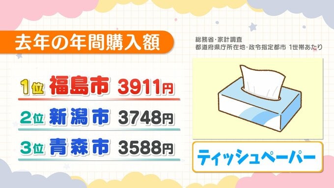 納豆購入額、福島市が2年連続日本一 モモ、せんべい、意外なものもナンバーワン 福島 テレビユー福島 2026年2月6日(金) 21:46 国内 正解は、どの家庭にもある〇〇 正解は、ティッシュペーパーです。購入額3911円で、意外にも、1位ということになりました。