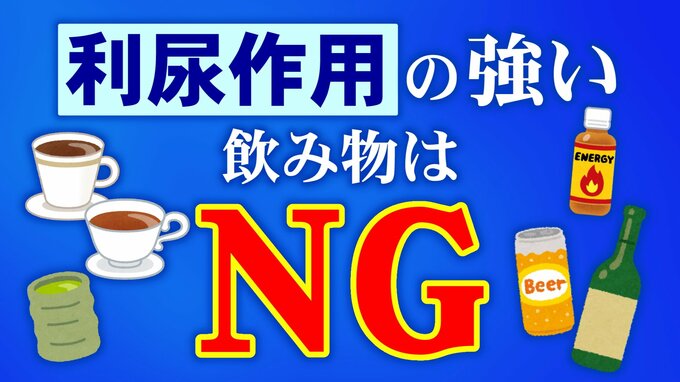 田中会長「利尿作用の強い飲み物ですね。コーヒーや紅茶・緑茶、エナジードリンク、アルコールが挙げられます」