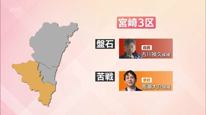 一騎打ちとなっている宮崎3区は、自民党・前職の古川禎久氏が参政党・新人の高瀬大介氏を大きく引き離しています。